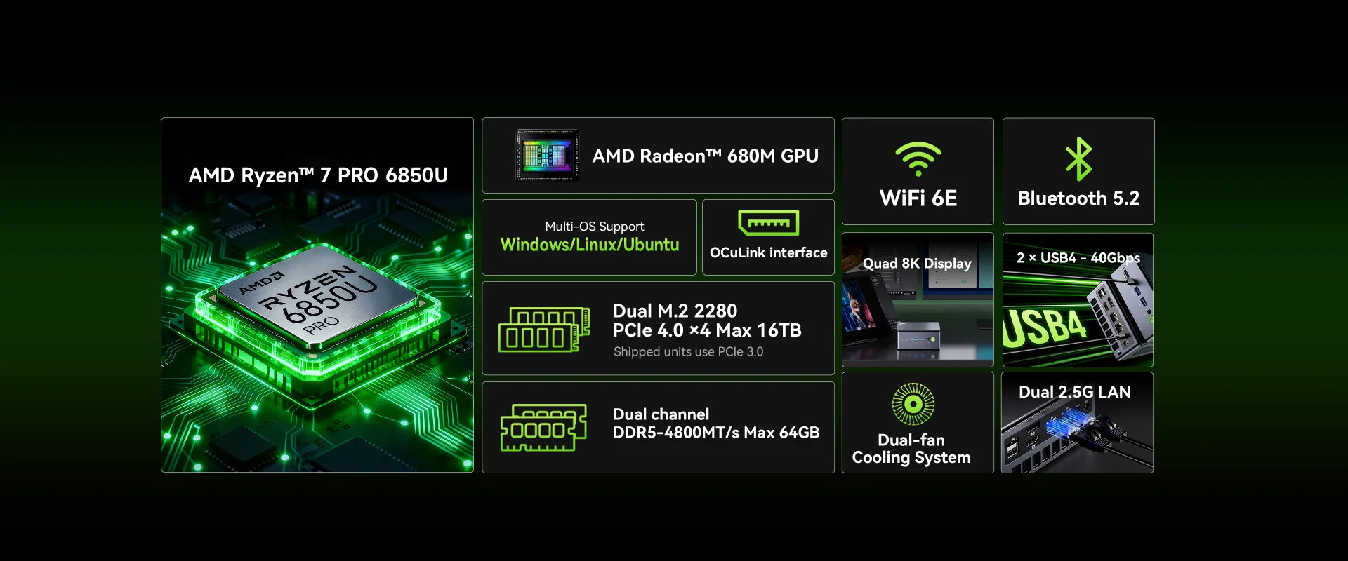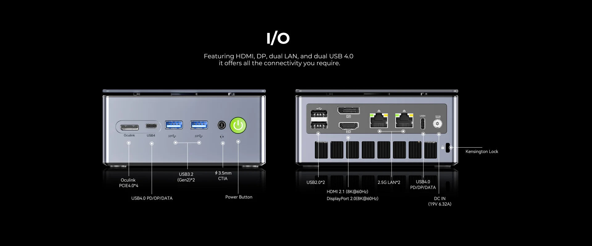 - Display & Connectivity: 8K display output, Wi-Fi 6E, Bluetooth 5.2, dual 2.5 Gigabit LAN, and OCuLink support for eGPU