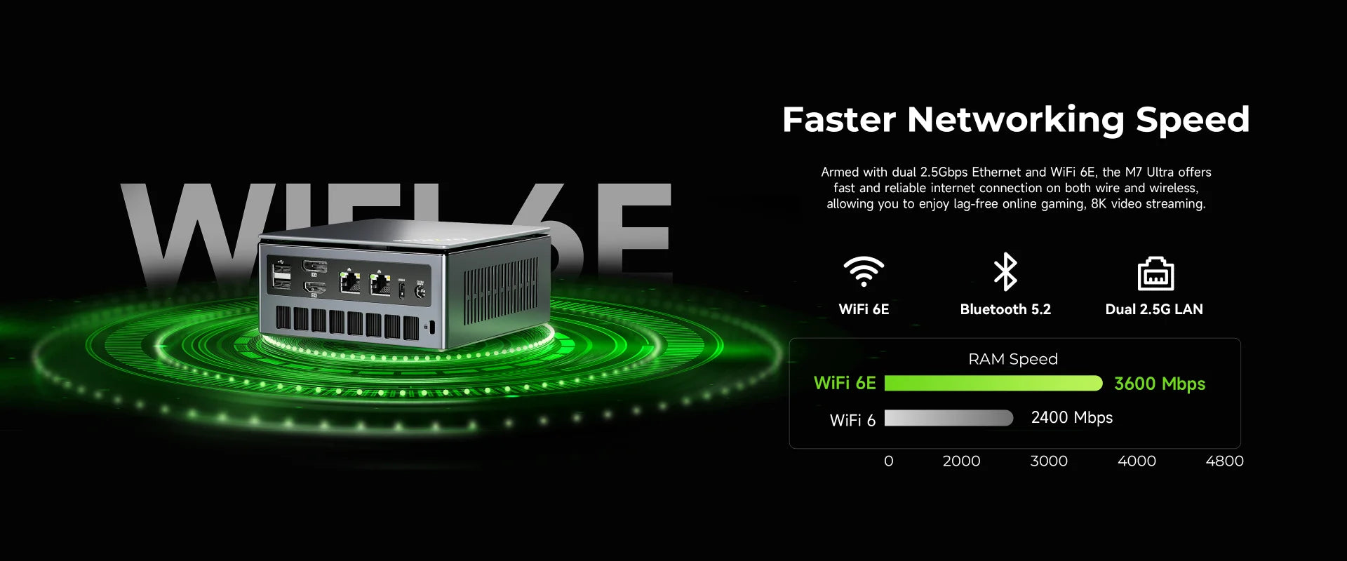 WiFi 6E (RZ616, up to 2.4Gbps), Bluetooth 5.2, Dual Intel I226-V 2.5G LAN