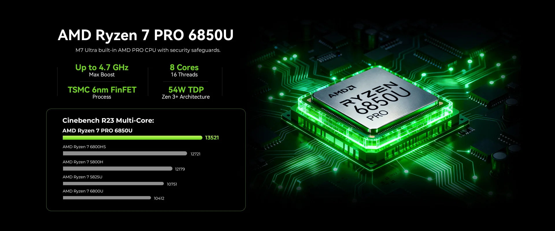 AMD Ryzen PRO 6000 Series, 8 cores / 16 threads, TSMC 6nm FinFET process, base frequency: 2.7GHz, MAX 4.7GHz; 512 KB L1 Cache/4 MB L2 Cache/16 MB L3 Cache; Zen 3+ CPU architecture; Silent mode: 35W, Balanced mode: 45W, Performance mode: 54W (peak 54W)