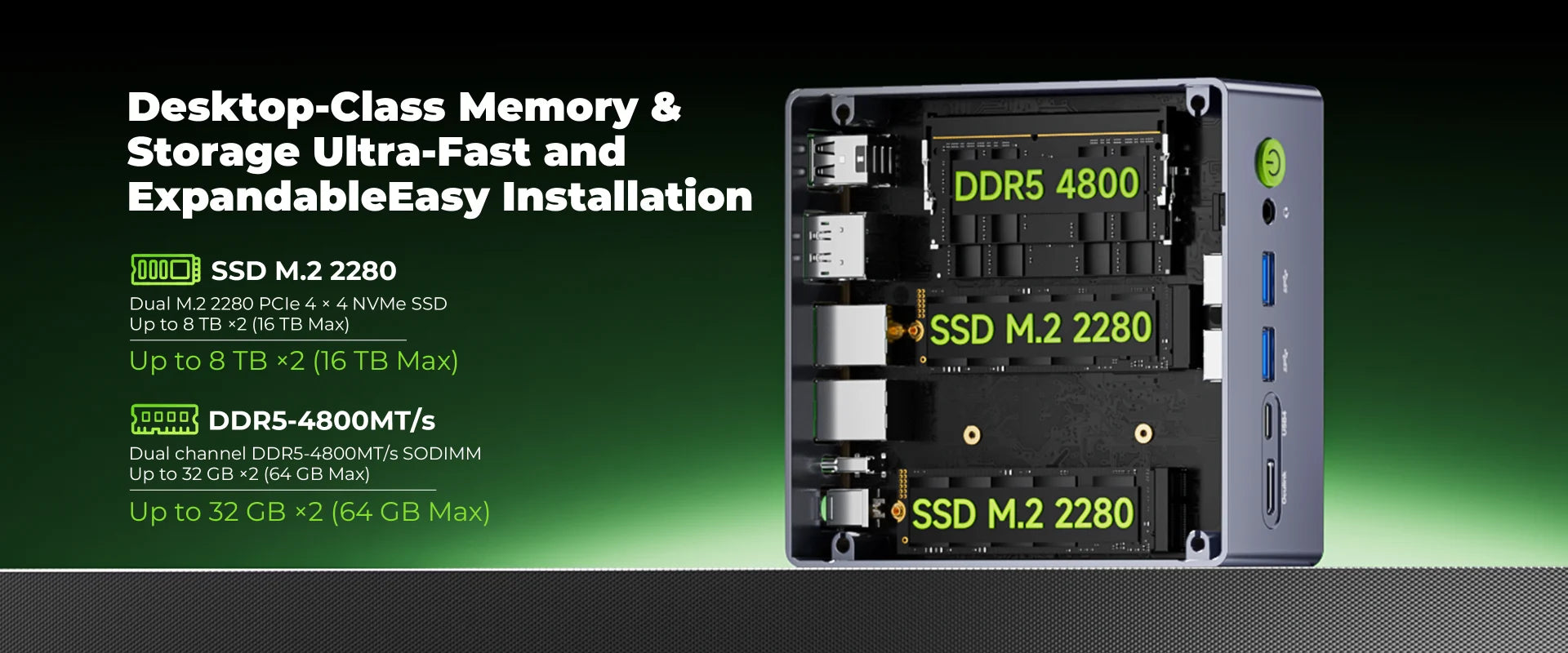 2×SO-DIMM DDR5-4800MT/s, 16GB / 32GB pre-installed, up to 64GB